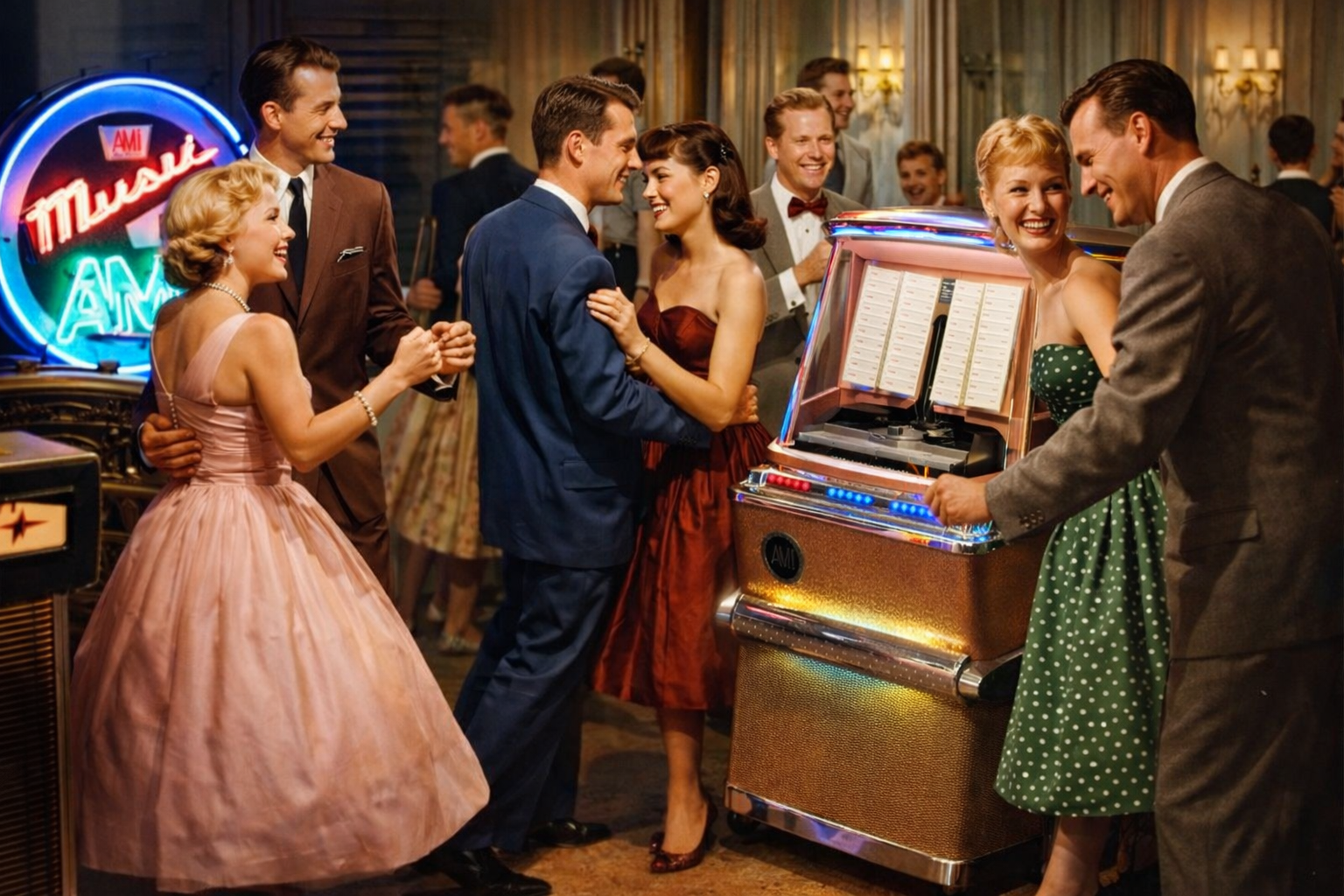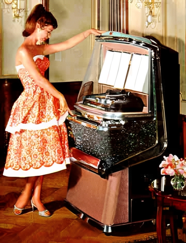 En ese entorno, las Jukebox (aparatos que tienen la capacidad de reproducir discos elegidos automáticamente) se valoraban por su habilidad para atraer a los clientes en cafeterías y bares, generando un ambiente animado gracias a la música popular del momento.